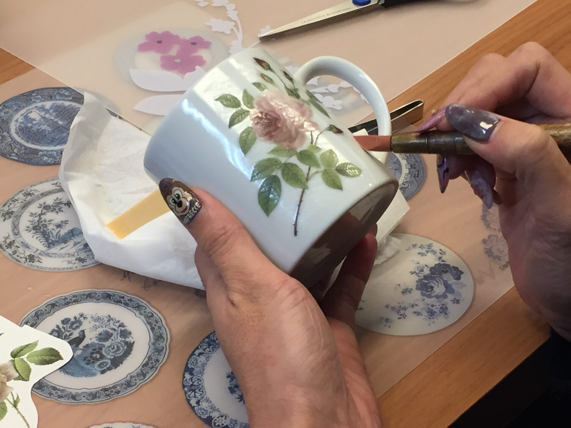 今回ポーセラーツ体験の講師でもあるsplendorの太治様から流れの説明があり、食器に貼る絵柄を何十種類もあるフィルムから探します。
